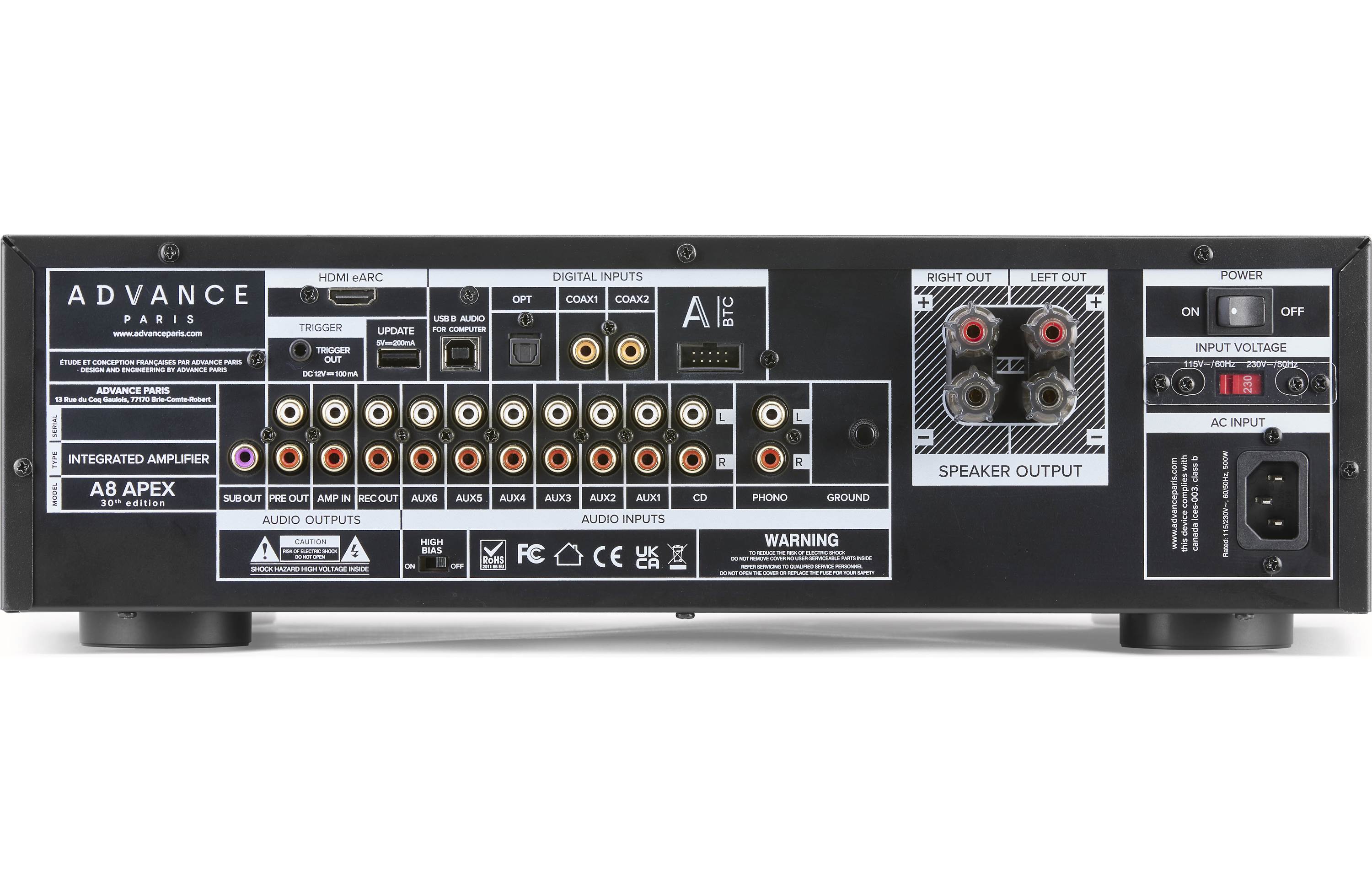 High Bias switch lets you select warm, detailed Class-A-like performance at low volumes with automatic switching to AB for full power